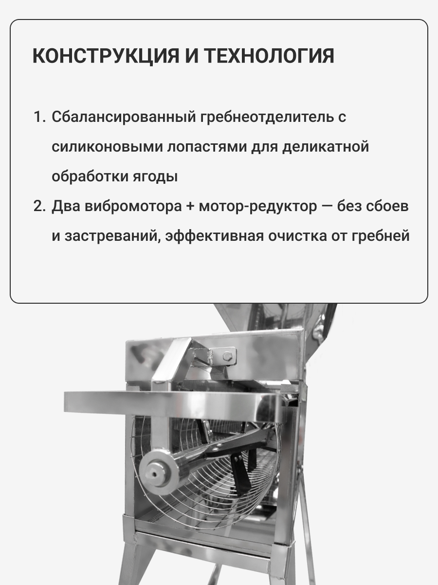 • Сбалансированная работа гребнеотделителя позволяет качественно отделить кисточку, не повреждая ягоду, так как лопасти отделяющего шнека сделаны из силикона, а так же предотвращает попадания гребней в сусло, что благоприятно отразится на конечном продукте.